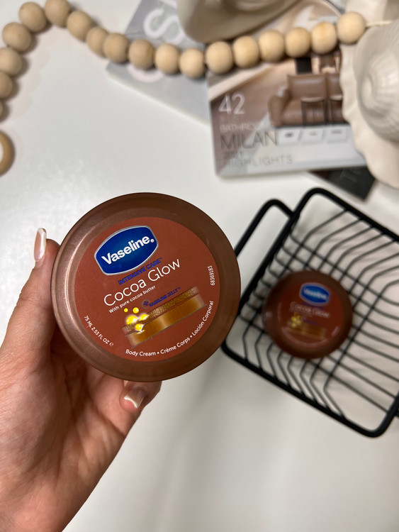 کرم بدن کره کاکائو وازلین Vaseline مدل cocoa Glow ، دارای فرمول مغذی جهت تغذیه قوی و احساس پوستی نرم و درخشان می باشد. کرم بدن وازلین حاوی کره کاکائوی خالص جهت افزایش شفافیت و درخشندگی پوست به همراه شی باتر جهت تغذیه قوی و نرم کنندگی پوست است. علاوه بر این گلیسیرین جهت رطوبت رسانی و میکرو ذرات ژلی وازلین جهت رفع خشکی پوست می باشد. این فرمول تایید شده کلینیکال است و بدون احساس سنگینی ، خشکی پوست را پس از اولین استفاده برطرف می کند.